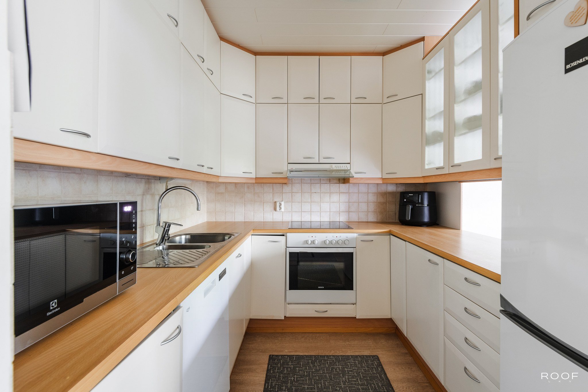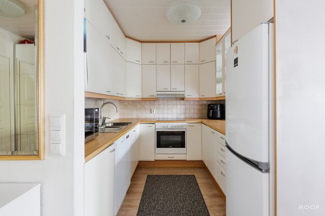 - Varustus: jääkaappi/pakastin, liesituuletin, astianpesukone, kiinteät valaisimet. Liesi: sähköliesi. Työtasot: laminaatti. Lattia: laminaatti.