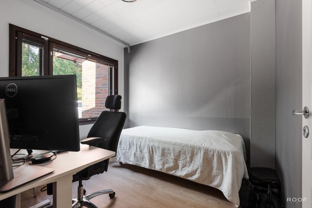 Alakerrassa on kodinhoitohuone wc:llä, pukuhuone, sauna, sekä kaksi makuuhuonetta, joista toisesta on käynti aidatulle pihalle.