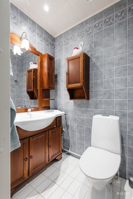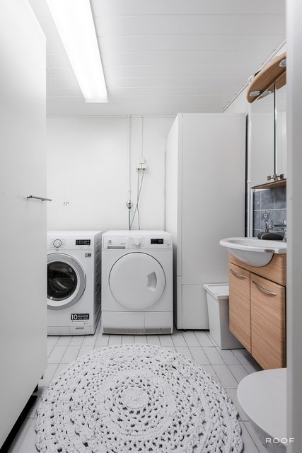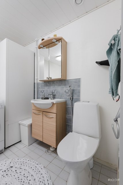 - Wc, käsibide, allaskaappi, peilikaappi, lämminvesivaraaja Varustus: pesukoneliitäntä, pesuallas, lattialämmitys, lattiakaivo. Lattia: laatta. Seinät: maalattu.