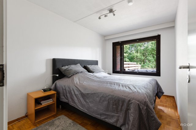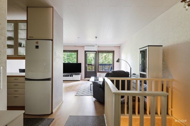 Yläkerrassa on yksi makuuhuone, wc, keittiö ja tilava olohuone, josta on käynti lasitetulle parvekkeelle.