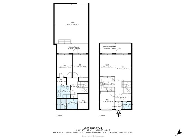 - Ei tarkistusmitattu. Pinta-alat saattavat tämän ikäisissä kohteissa (yhtiö rekisteröity ennen 01.01.1992) poiketa olennaisestikin asuinrakennusten nykyisten mittaustapojen ja standardien (SFS 5139) mukaan laskettavasta asuintilojen pinta-alasta. Pinta-ala voi siis olla edellä mainittua pienempi tai suurempi.