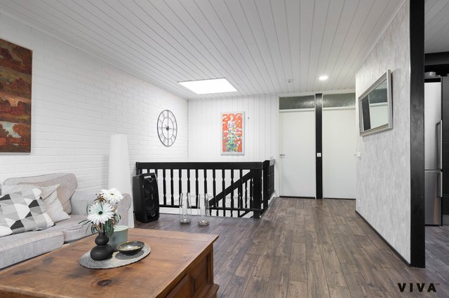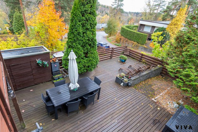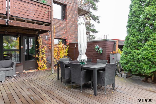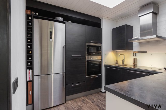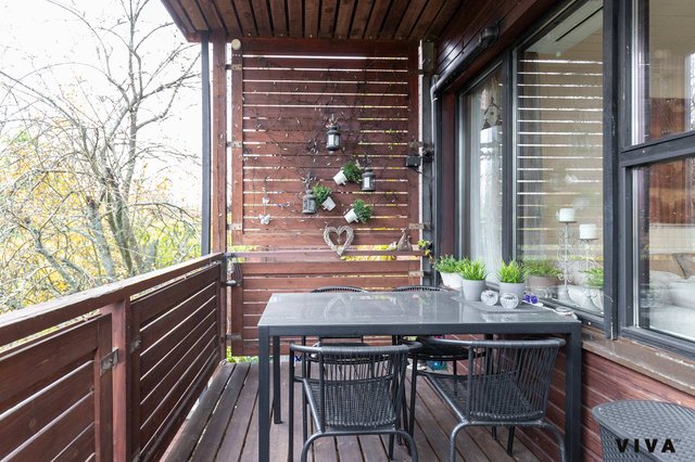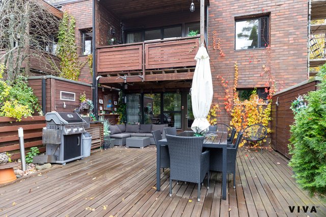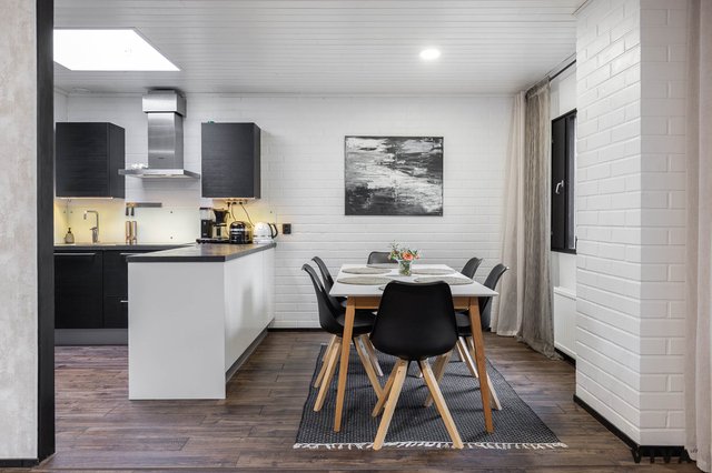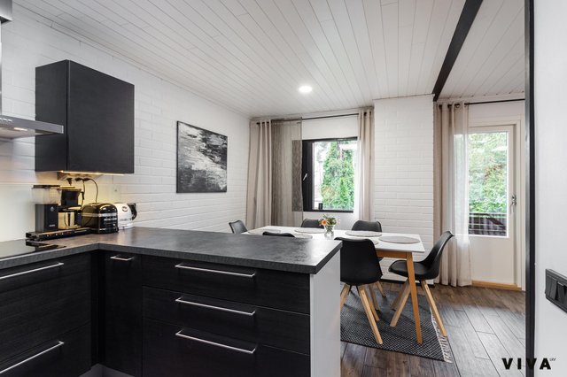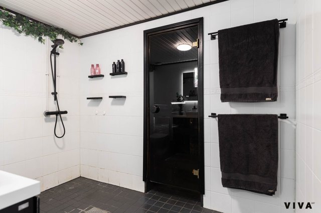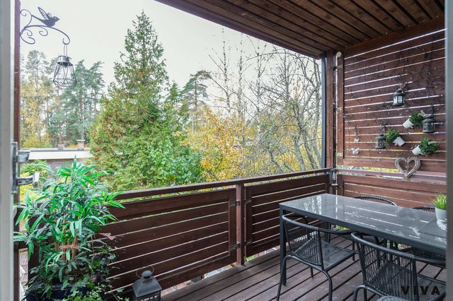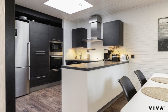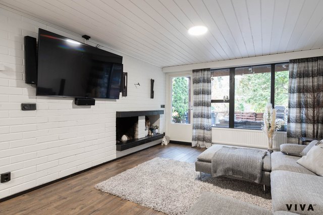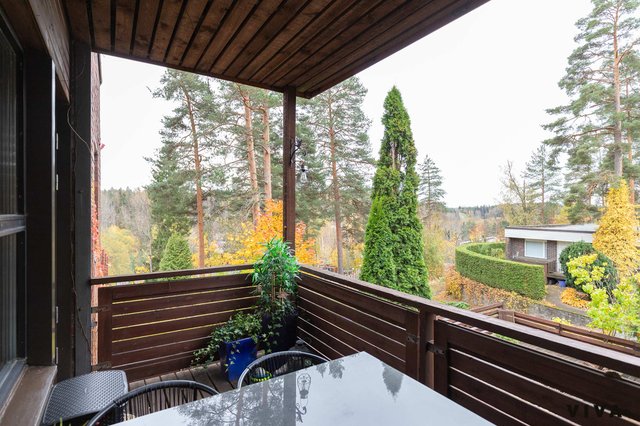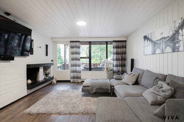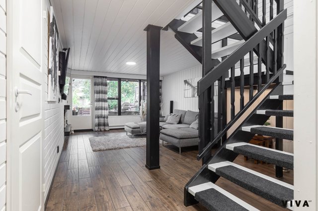 Asunnon alakerran olohuoneessa tunnelmaa luo kaunis takka ja luonnonvaloa tulvii sisään etelä-länsisuuntaisilta parvekkeilta ja terassilta. Keittiö on remontoitu, hyvin varusteltu ja moderni, sieltä löytyy kaikki tarvittava arjen sujuvuuteen. Kolme makuuhuonetta tarjoavat tilaa koko perheelle ja oma sauna kutsuu rentoutumaan kiireisen päivän päätteeksi.