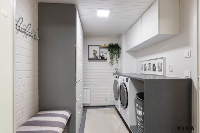 - Pesukone, kuivausrumpu, pesukoneliitäntä, pyykkikaapit, ja pöytätaso
