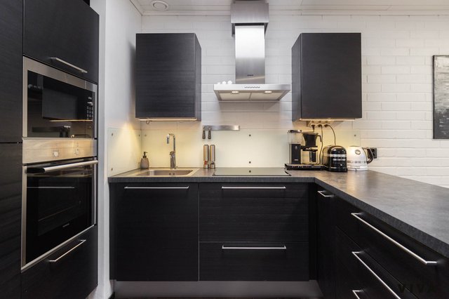 - Jääkaappipakastin, liesi, liesituuletin, mikroaaltouuni, astianpesukone, ja erillisuuni