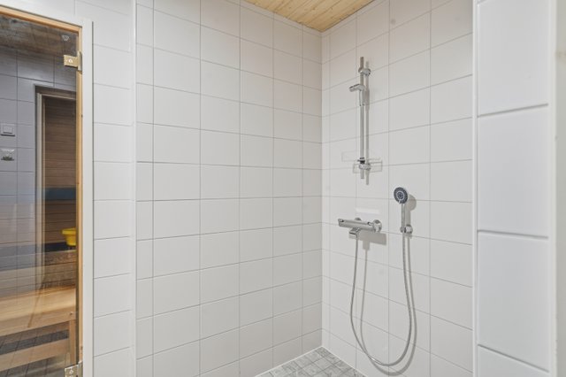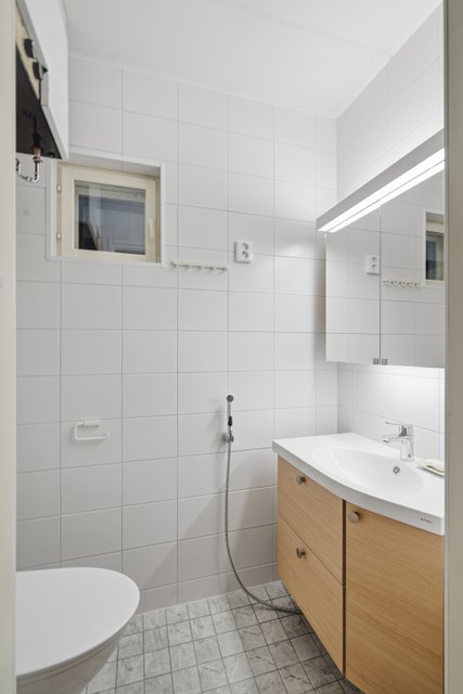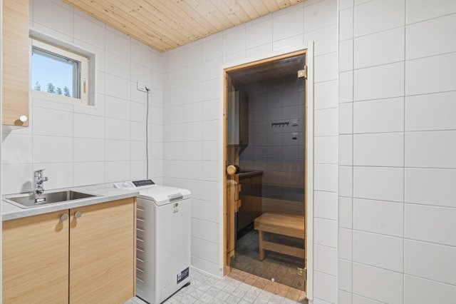 - Suihku, pesukoneliitäntä, lattialämmitys, pesuallas, ja leveä allaskaappi