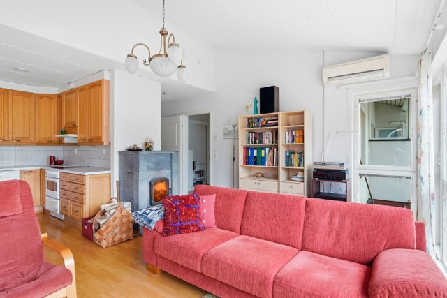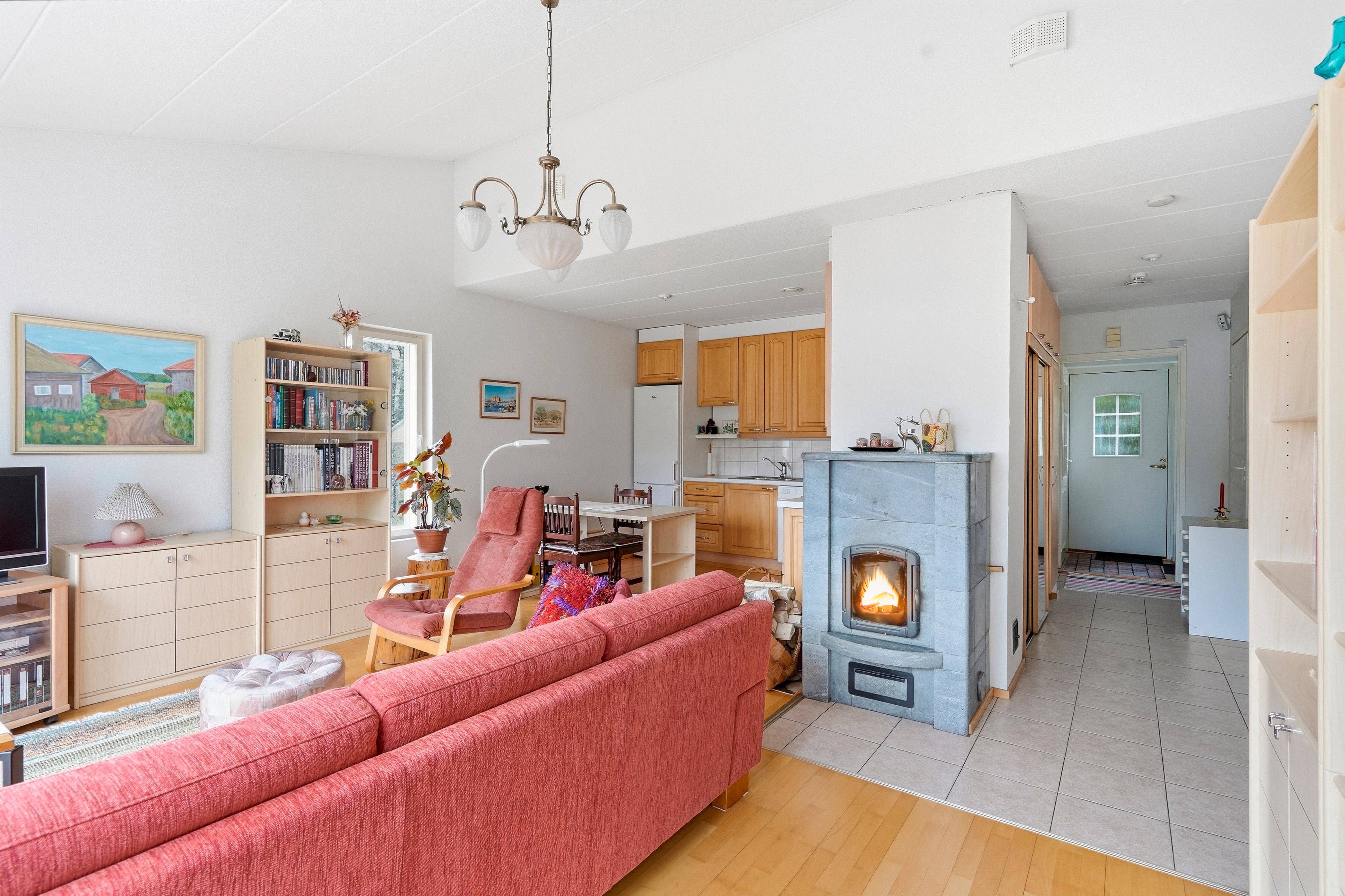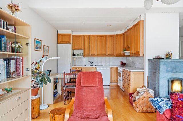 - Olohuone ja keittiö ovat yhtenäistä oleskelutilaa, Varaava takka