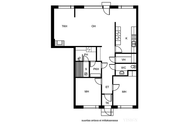 Keittiö on käytännöllinen ja mahdollistaa sujuvan arjen ruokapöytineen. Kahden hyvänkokoisen makuuhuoneen lisäksi kodissa on erillinen vaatehuone, joka tuo lisää säilytystilaa.