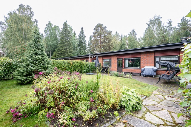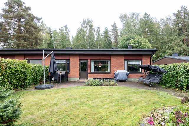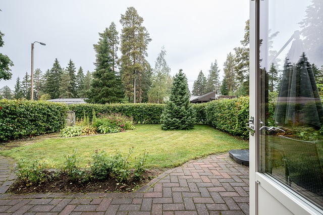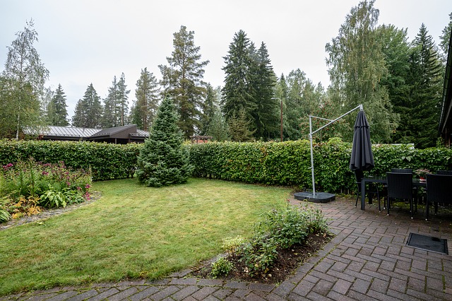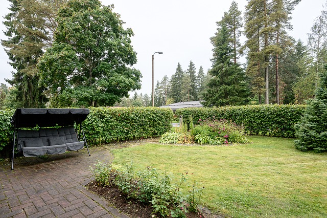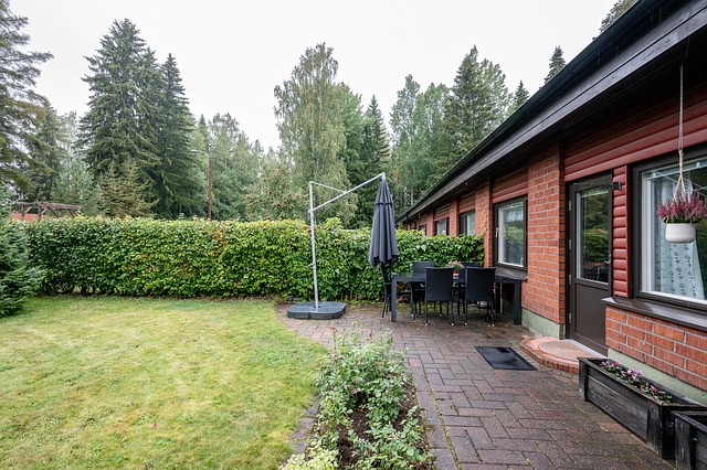 Asunnon takapiha on suojaisa ja vehreä, ihanteellinen paikka vapaa-ajan viettoon perheen kanssa.