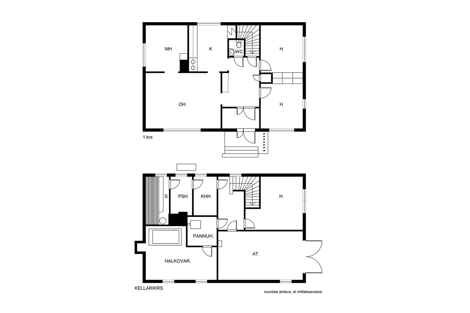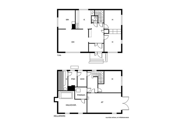 - Kellarikerroksessa huone, kodinhoitotila, pesuhuone, sauna sekä pannuhuone, varastotilaa ja autotalli, josta kulku ulos.