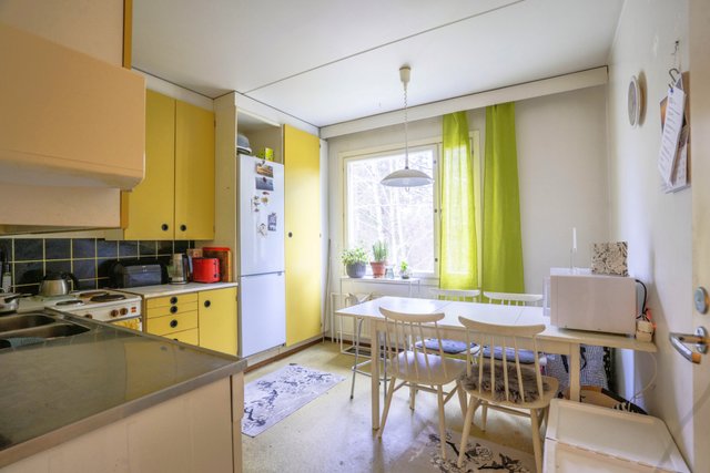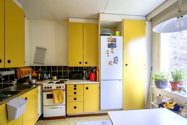 - Alkuperäinen kunto ja perusvarustus. Keittiön kaapit ja ovet ovat alkuperäiset, näitä moni ostaja haluaa jopa säilytettävän sellaisenaan, keltainen ajan mukainen alkuperäinen väri! Jääkaapi/pakastin, liesi/uuni. Iso ikkuna, jossa tuuletusikkuna.