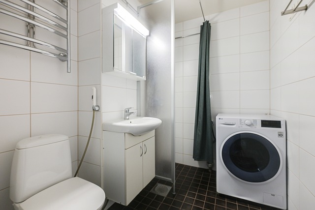 - WC-istuin, peilikaappi, suihkuseinä, pesukoneliitäntä, suihku, ja kiinteät valaisimet