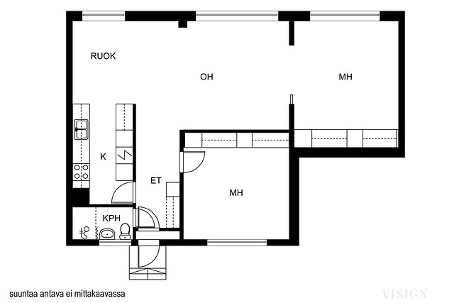 Tässä kodissa on tilava ja valoisa olohuone, kaksi mukavan kokoista makuuhuonetta, keittiössä on hyvin kaappitilaa, kylpyhuoneessa on wc-istun ja pesukoneliitäntä.
