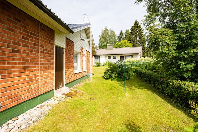 Piha-aluetta kiertää orapihlaja-aita, nurmikko-alue, runsaat kukkaistutukset ja penkit on hoidettu hyvin, lisäksi omenapuita ja marjapensaita.
