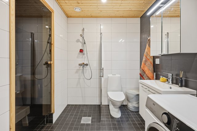 - WC-istuin, suihku, suihkuseinä, pesukoneliitäntä, lattialämmitys, peilikaappi, pesuallas, allaskaappi, ja bidee-suihku