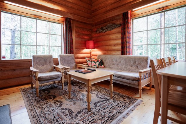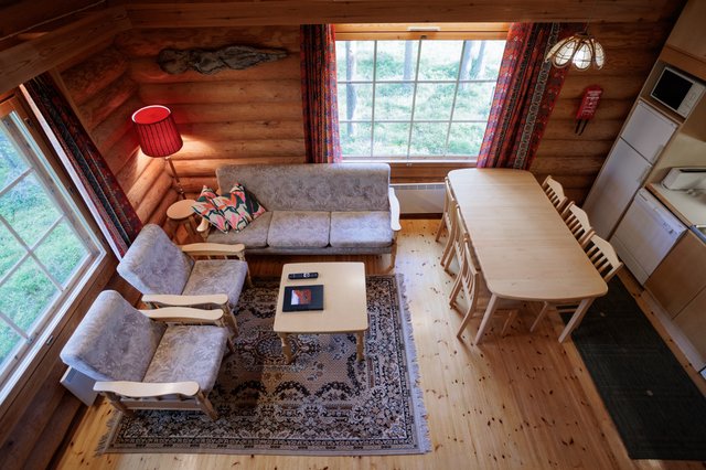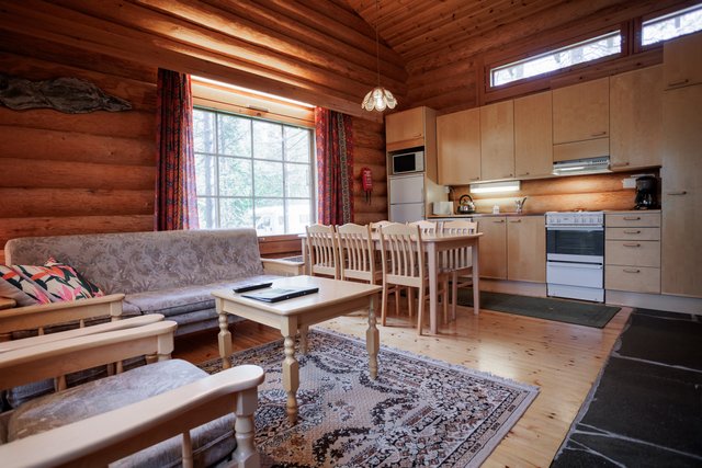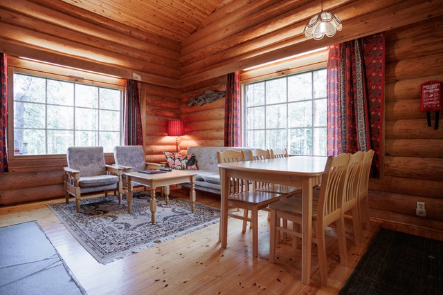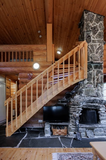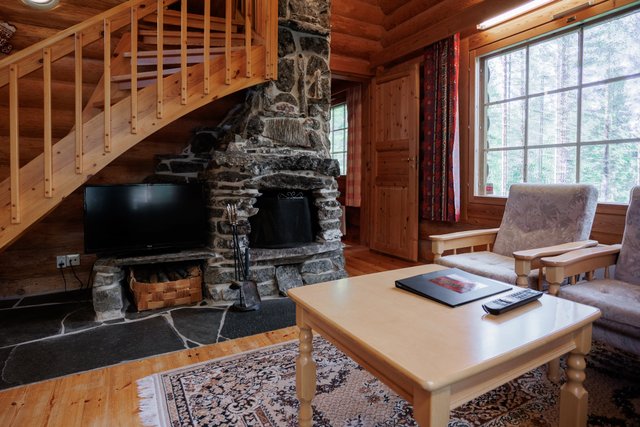 - Olohuone, tai paremminkin tupa, on tämän tunnelmallisen mökin sydän. Tilaa yhdessäoloon on mukavasti, ja lisälämpöä paukkuviin pakkasiin tuo upea luonnonkivinen takka. Tuvan laidalta on kulku alakerran makuuhuoneeseen, täydellinen paikka nukkumatin vierailun jälkeen. Lisäksi mökki majoittaa helposti lisää suuria seikkailijoita suurelle parvelle – tilaa riittää kaikille!