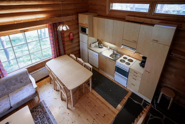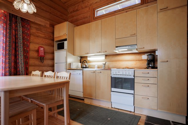 - Mökin keittiö on kaikin puolin hyvässä kunnossa. Ajattomat puukaapistot ovat kestäneet aikaa erinomaisesti, ja työskentelytilaa on riittävästi herkullisten aterioiden valmistamiseen nälkäisille tunturin samoajille.