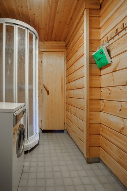 - Kohteen toiminnalliset pesutilat ja wc ovat kätevästi heti sisäänkäynnin läheisyydessä. Lumiset ja märät vaatteet eivät sotke täten tiloja, sillä siirtyminen suoraan märkätiloihin on vaivatonta. Pesutilojen yhteydessä on myös wc, joka on erotettu omalla seinällä osaksi tilaa. Pesukone on valmiina käytettäväksi, ja suihkukaappi pitää vesiroiskeet hallinnassa pitäen pesuhuoneen tilat kuivina. Huoneiston rentouttava saunatila sijaitsee myös pesutilojen yhteydessä, mahdollistaen mielen ja kehon palautumisen päivän päätteeksi.