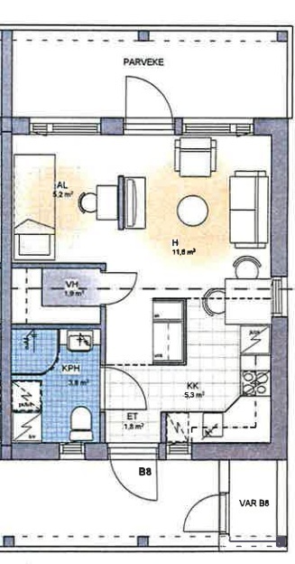 - Eteinen, keittiö ja kylpyhuone laatta. Olohuone ja makuualkovi laminaatti.