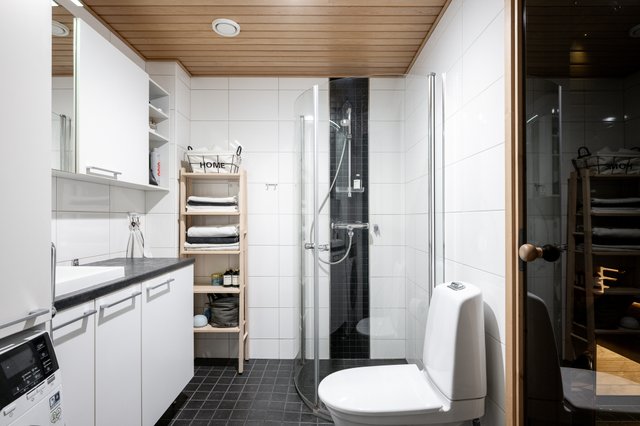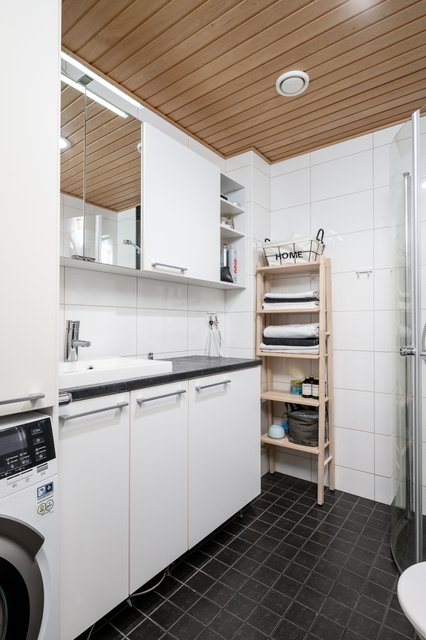 - WC-istuin, suihku, lattialämmitys, peilikaappi, suihkuseinä, ja pesukoneliitäntä