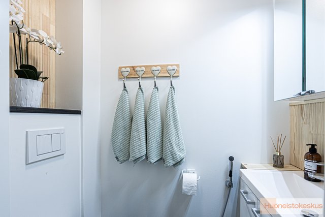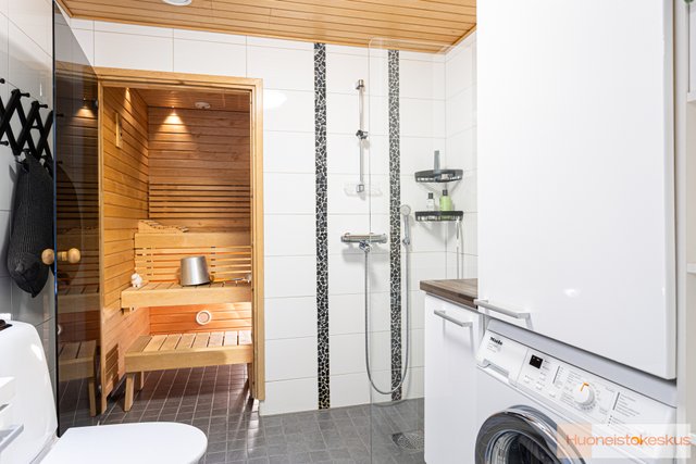 - WC-istuin, suihku, suihkuseinä, pesukoneliitäntä, lattialämmitys, peilikaappi, allaskaappi, ja pyyhetelineet