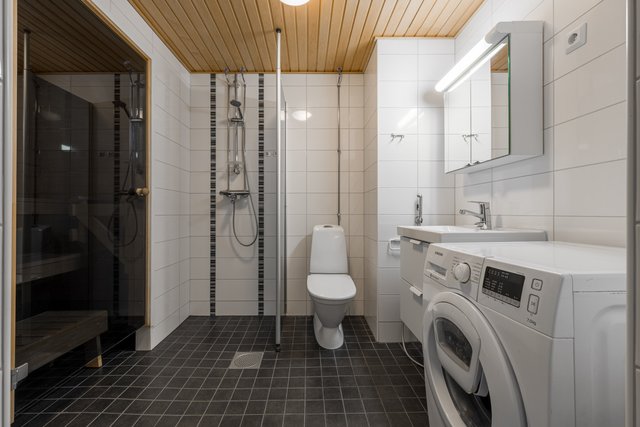 - WC-istuin, suihku, pesukoneliitäntä, peilikaappi, lattialämmitys, allaskaappi, bidee-suihku, suihkuseinä, ja pesuallas
