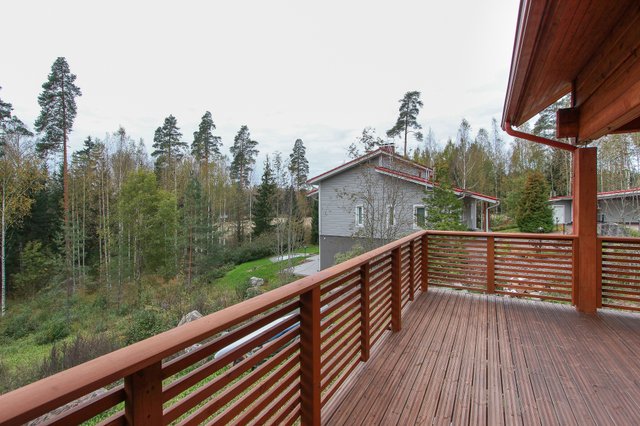 Alakerrassa sijaitsevat takkahuone, kaksi makuuhuonetta, sauna ja pesuhuone, kodinhoitohuone sekä erillinen wc. Kaksi parveketta, keittiöstä ja vierashuoneesta, tarjoavat näkymät takapihan luontoon.
