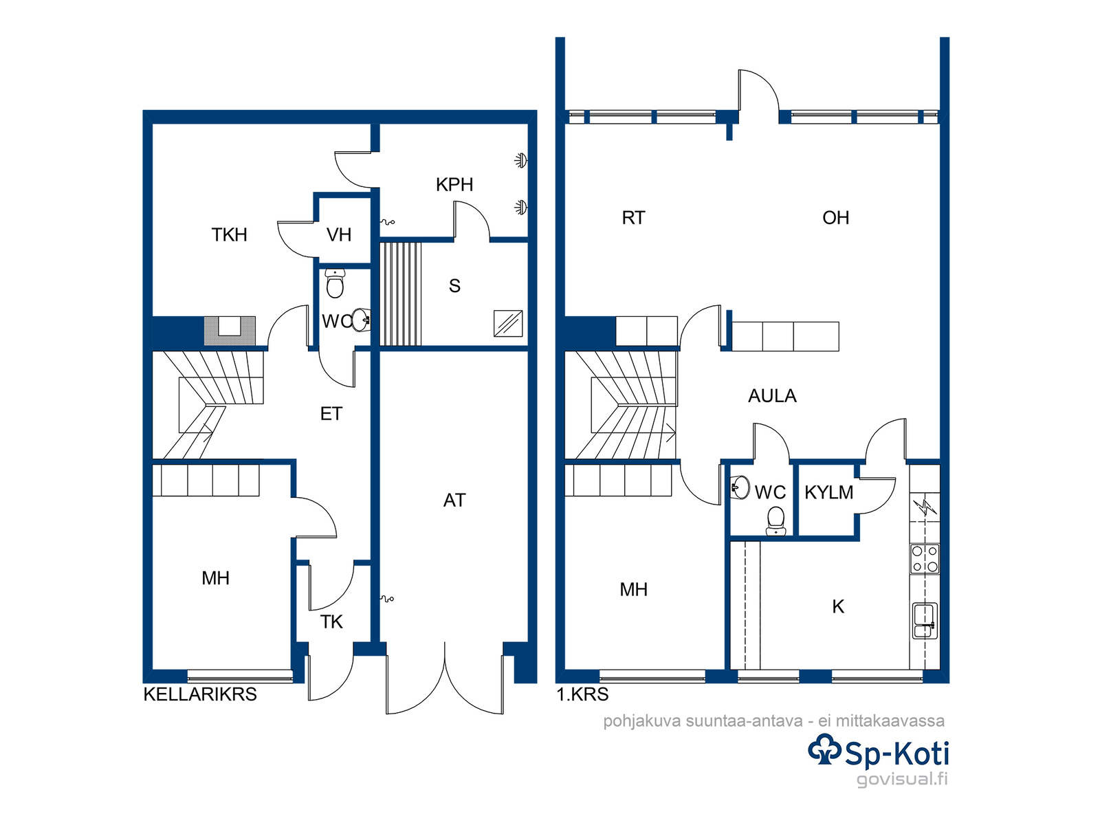 Avarat tilat sijaitsevat kahdessa tasossa. Huoneiston alakerrassa ovat mm. pesutila, sauna, wc, vaatehuone, takkahuone ja makuuhuone, jota käytetty lähinnä varastona, sekä oma lämmin autotalli. Yläkerrasta löytyvät huoneiston olohuone, keittiö, ruokailuhuone ja makuuhuone, sekä terassi.