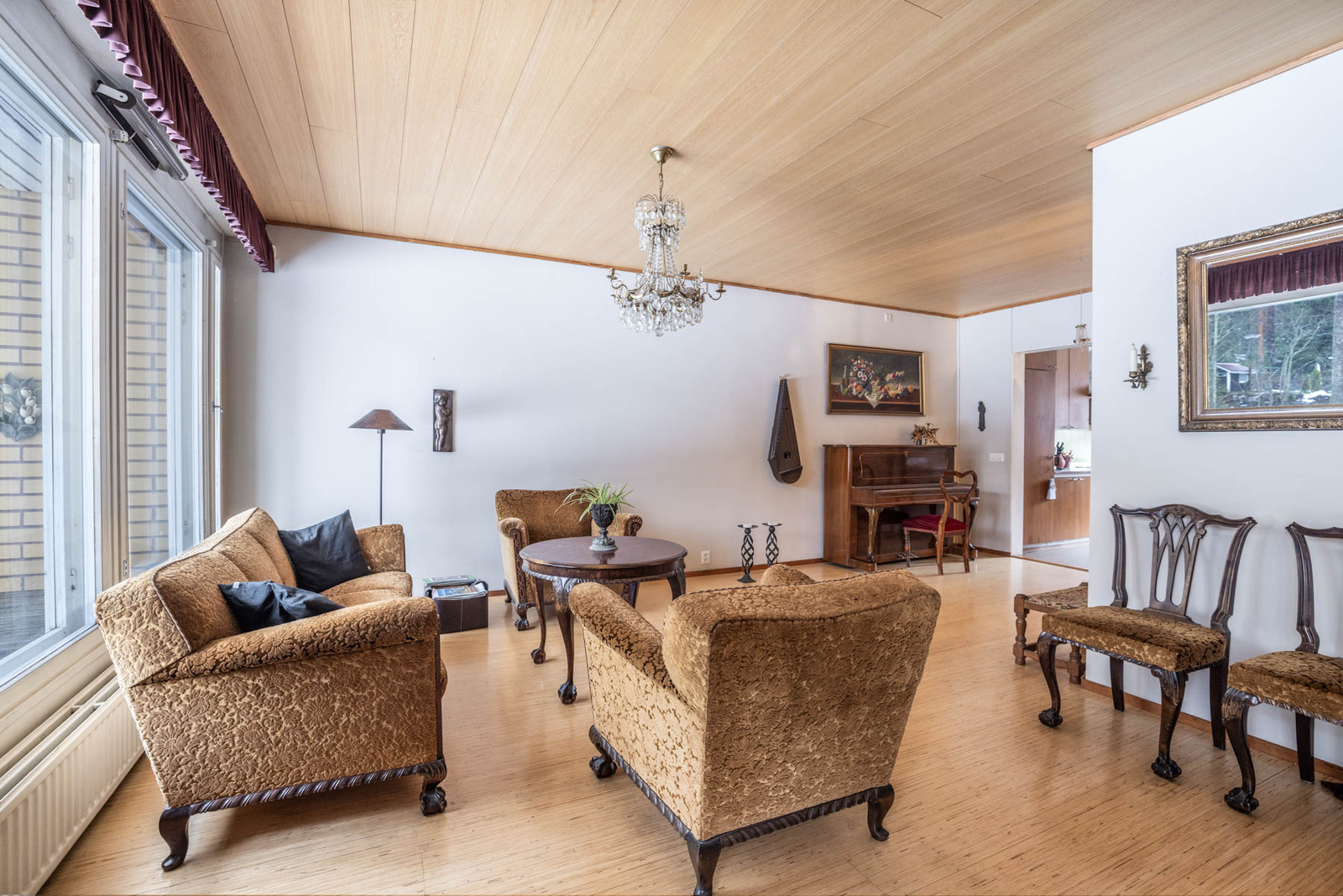 - Iso ja avara olohuone, jonka yhteydessä myös ruokailuhuone. (ent. makuuhuone). Olohuoneesta käynti oleskelupihan terassille. Olohuoneen lattiapintamateriaali on, joko laminaattia tai parkettia. Ruokailuhuoneen seinät maalattua tapettia, lattia parketti tai laminaatti.