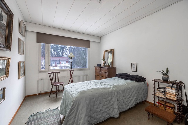 - Reilunkokoiset makuuhuoneet sekä ylä- että alakerrassa. Yläkerran toinen makuuhuone on muutettu ruokailutilaksi, jonka voi halutessaan muuttaa helposti takaisin makuuhuoneeksi. Alakerran makuuhuoneessa iso ikkunan Kankaantaustantien suuntaan. Makuutilaa tai vierasvaraa on myös takkahuoneessa.
