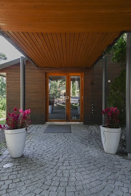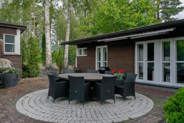 Tontille käveltäessä huomio kiinnittyy tyylikkääseen sisääntuloon, polveilevaan maastoon ja hulppean pitkään julkisivuun!