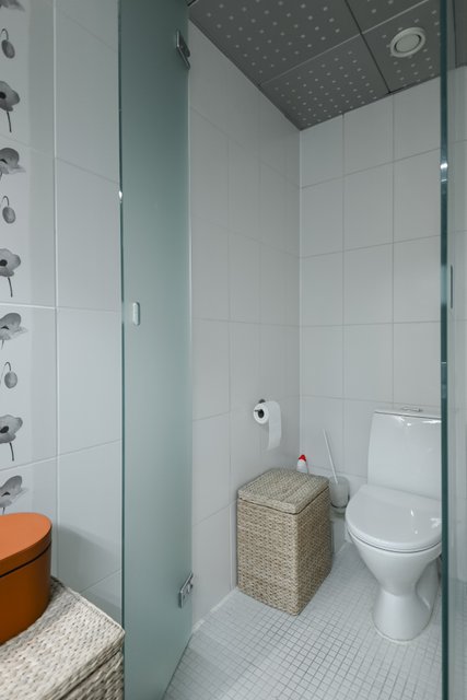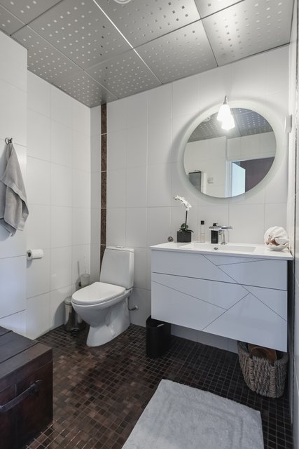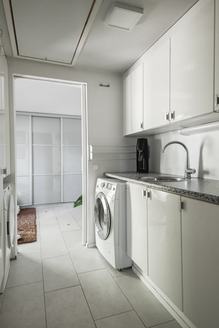 - Pesukoneliitäntä, lattiakaivo, pyykkikaapit, pöytätaso, ja tila pesutornille