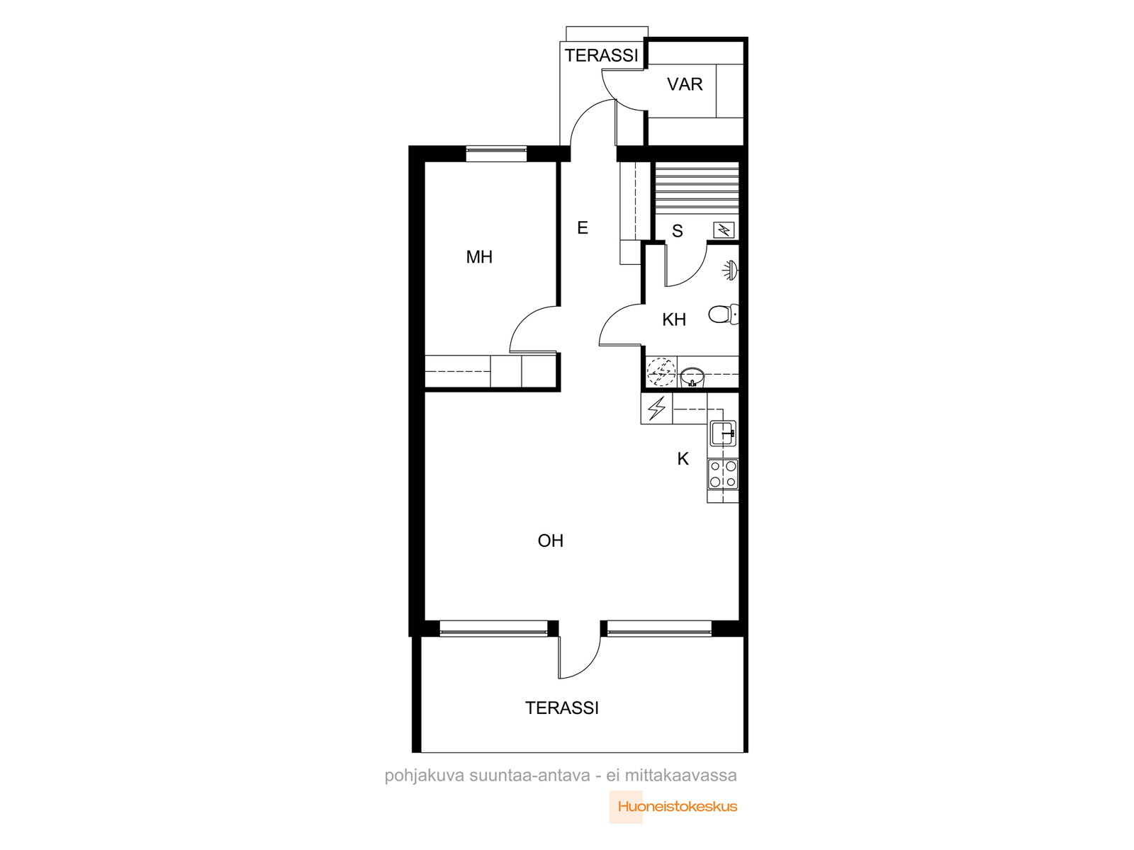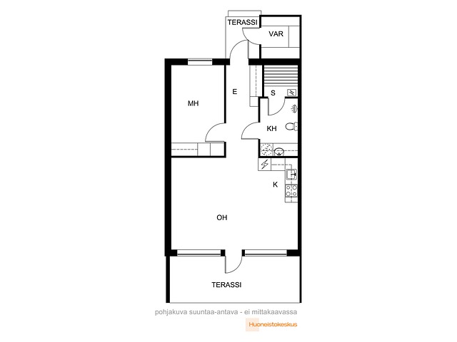 Todella toimiva pohjaratkaisu. Olohuone ja keittiö yhtenäistä tilaa ja mukavan kokoinen makuuhuone.