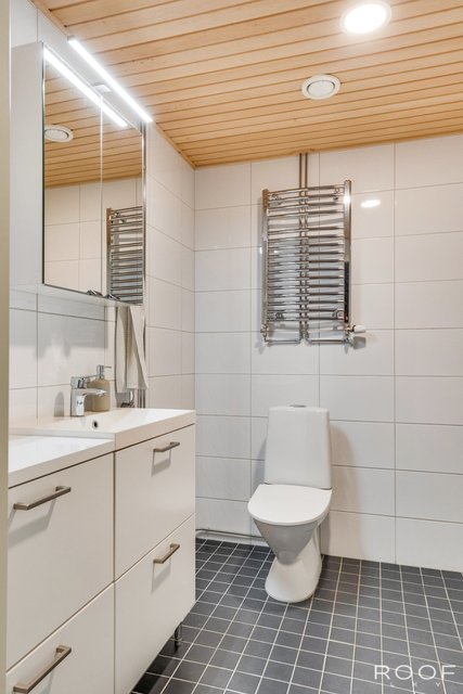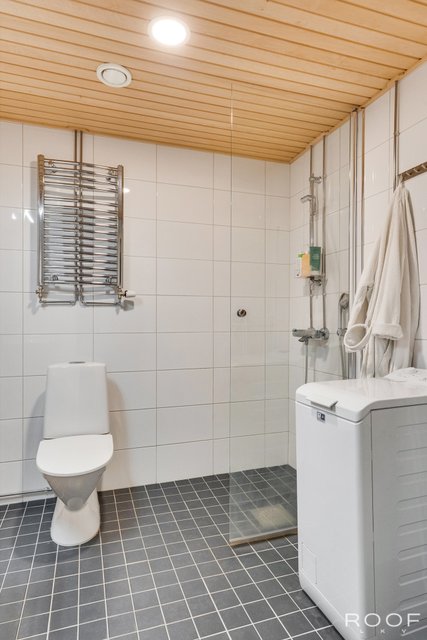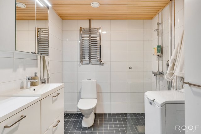 - Varustus: wc-istuin, suihku, suihkuseinä, pesukoneliitäntä, lattialämmitys, peilikaappi.