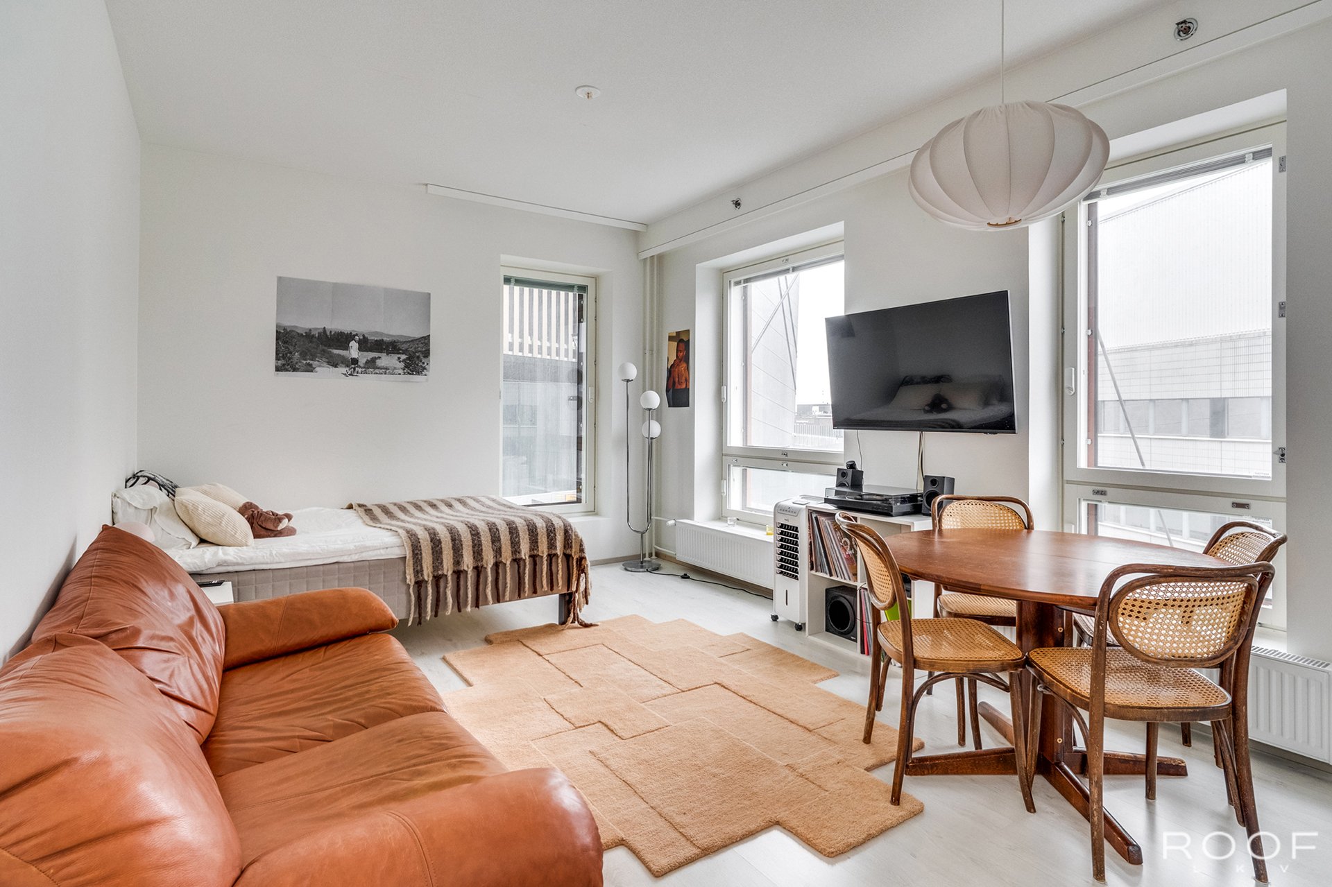 - Olohuoneeseen mahtuu suuri 160cm sänky sekä sohvaryhmä. Suuret ikkunat lisäävät avaruutta ja tilantuntua.