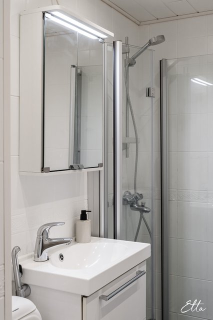 - WC-istuin, suihku, pesukoneliitäntä, suihkuseinä, bidee-suihku, peilikaappi, pesuallas, allaskaappi, ja lattialämmitys