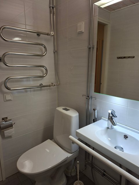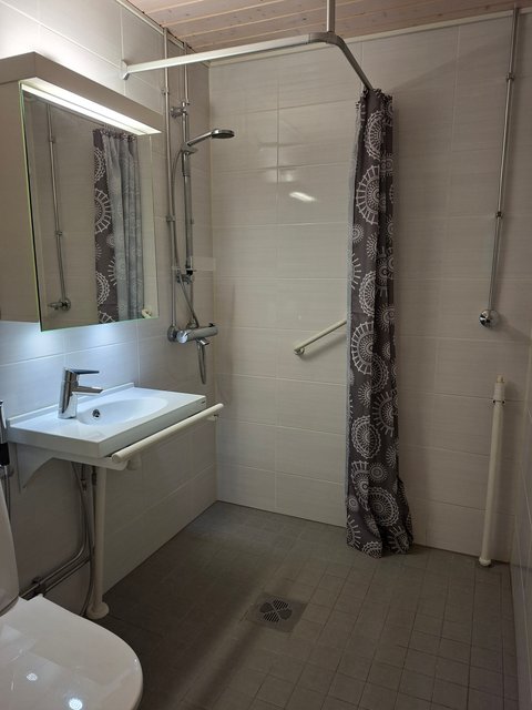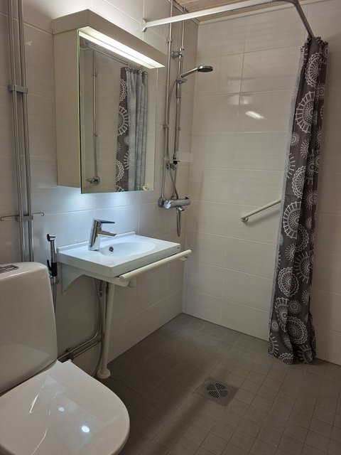 - WC-istuin, suihku, pesukoneliitäntä, peilikaappi, bidee-suihku, ja pesuallas
