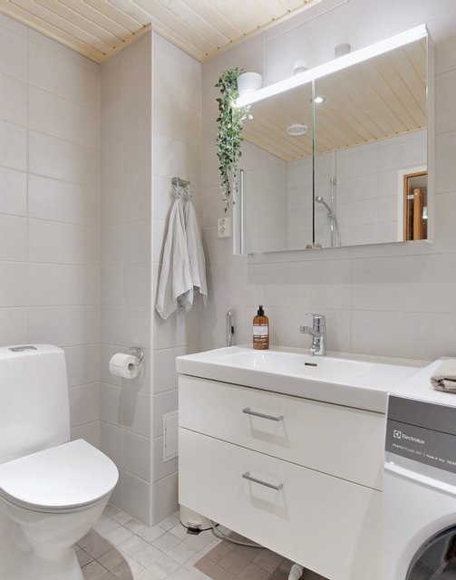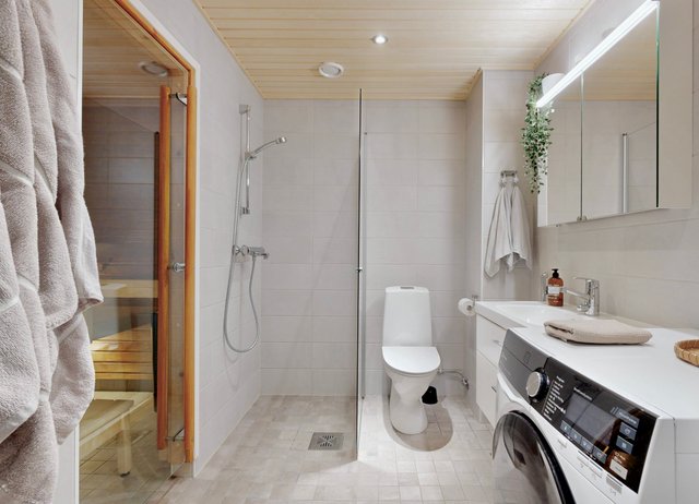 - VARUSTUS: Suihku, Suihkuseinä, WC-istuin, Pesukoneliitäntä, Allaskaappi, Allas, Hana, Peilikaappi, Pyykkikaappi. Lattialämmitys. SEINÄ: Laatta. LATTIA: Kaakeli.
