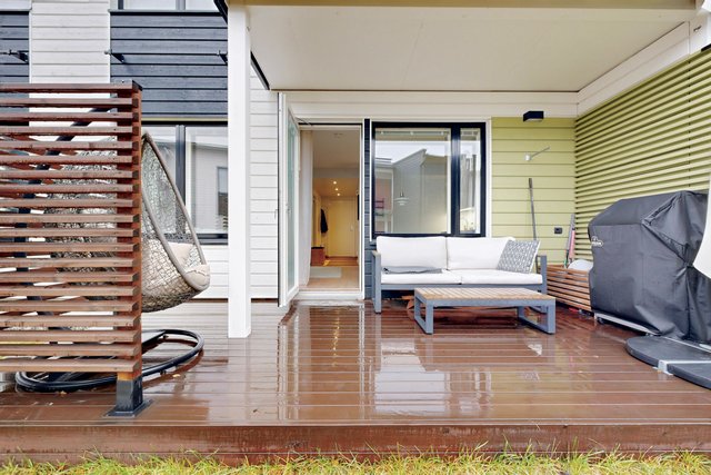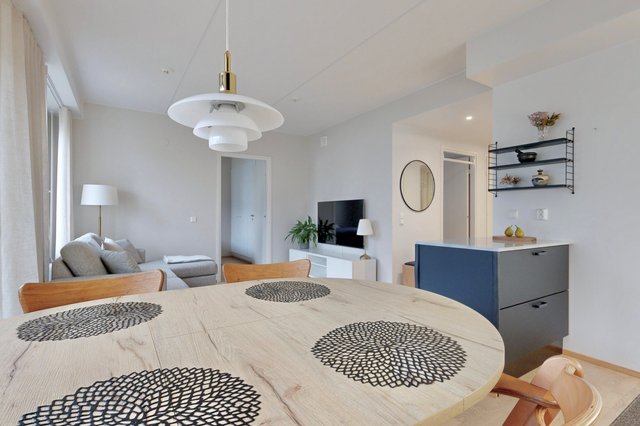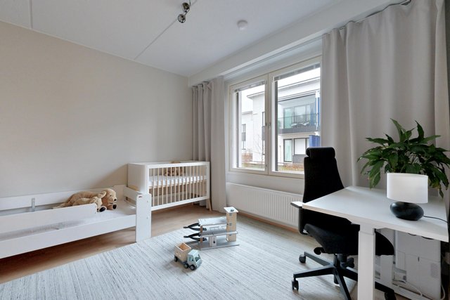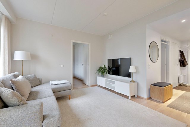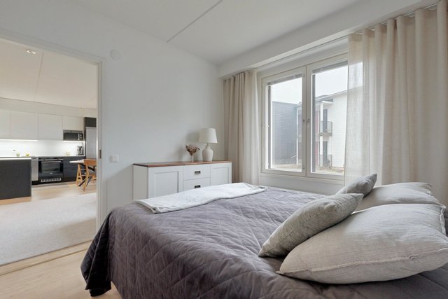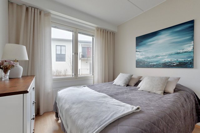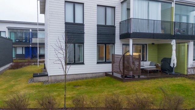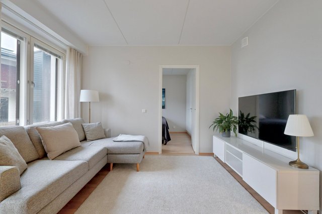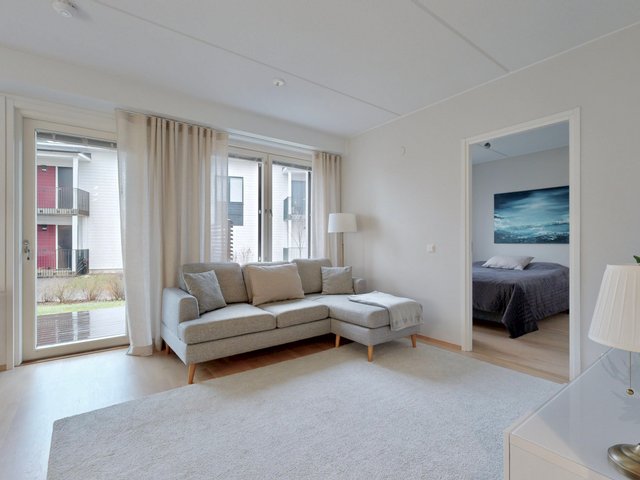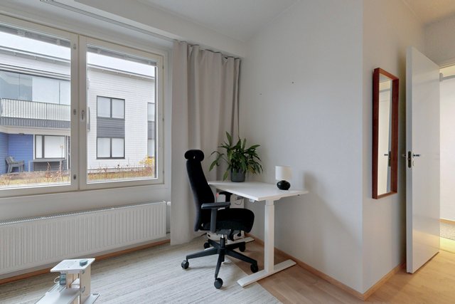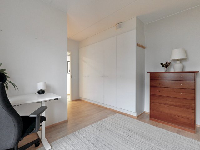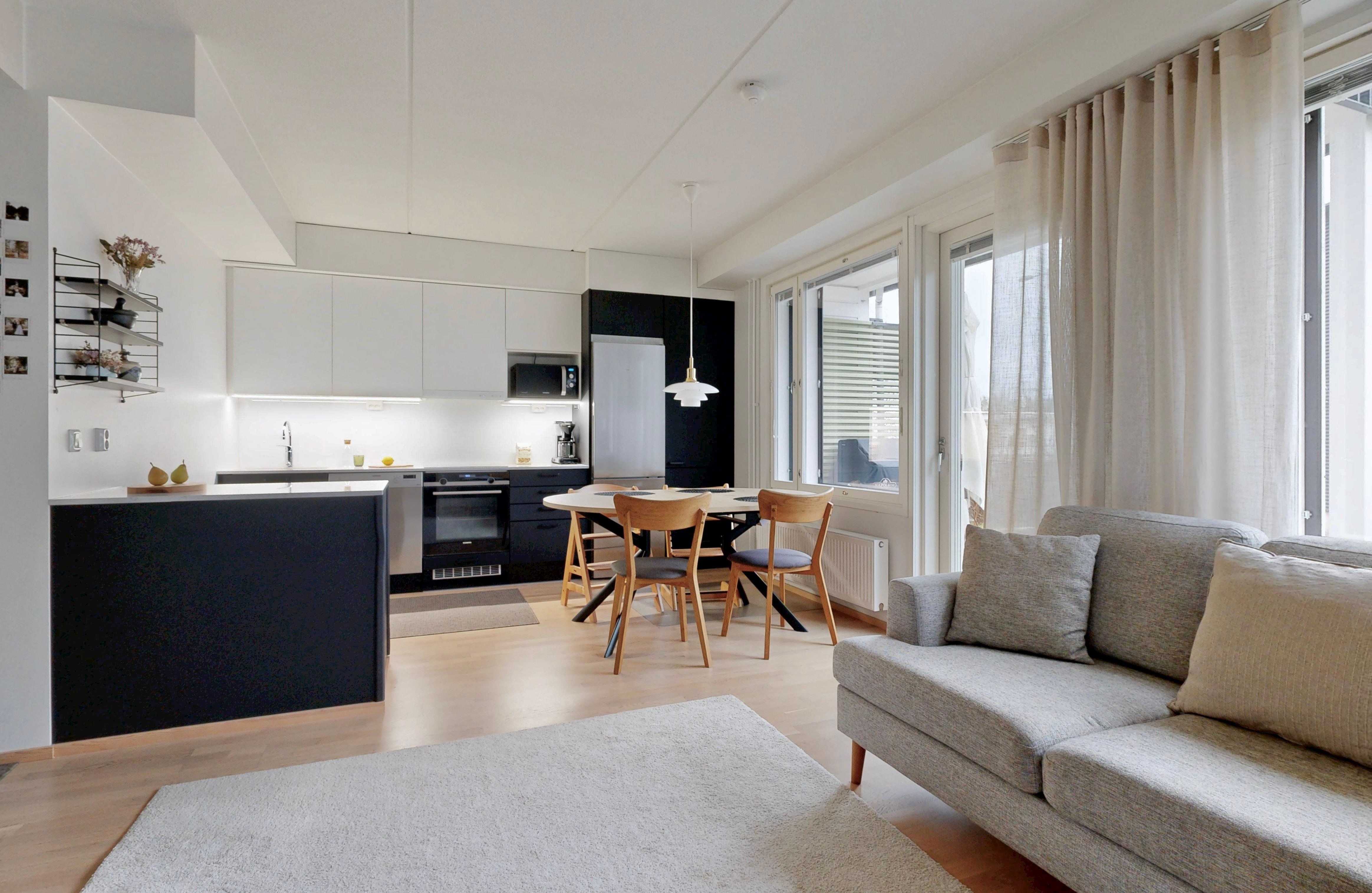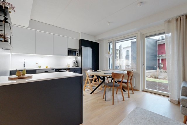Olohuone ja ruokailutila muodostavat yhtenäisen tilan, joka toimii niin perheen kuin vieraiden kanssa. Olohuoneesta on käynti pihalle ja suojaiselle terassille. Tyylikäs ja moderni avokeittiö, jossa on muun muassa hyvin säilytys-ja laskutilaa, kvartsikivitasot sekä erillinen saareke. Tilava kylpyhuone omalla saunalla. Kaksi makuuhuonetta, joista toista voi käyttää työ-/lastenhuoneena. Joka huoneessa kaapistot ja eteisen yhteydessä vaatehuone.