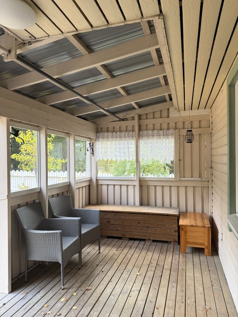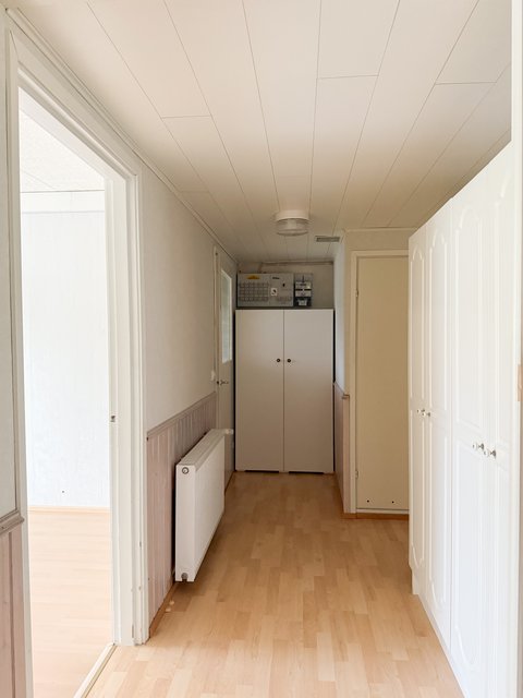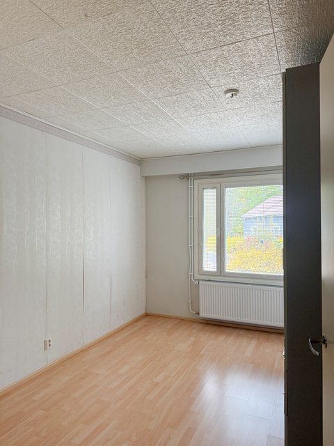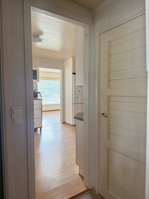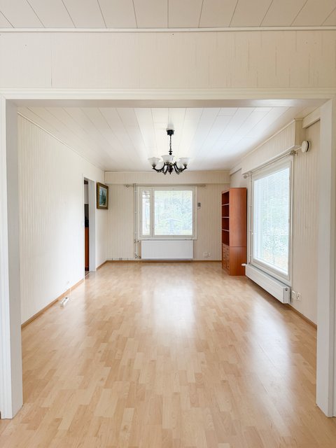 - Olohuoneen perällä on ollut aikoinaan makuuhuone, ja siihen on mahdollisuus tehdä talon kolmas makuuhuone.