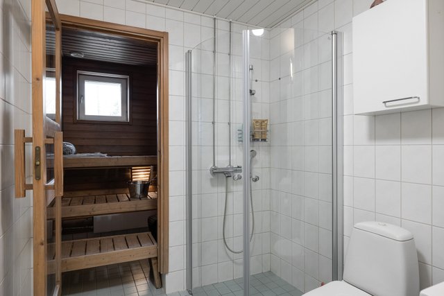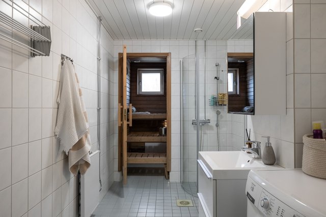 - WC-istuin, suihku, suihkuseinä, pesukoneliitäntä, peilikaappi, ja bidee-suihku