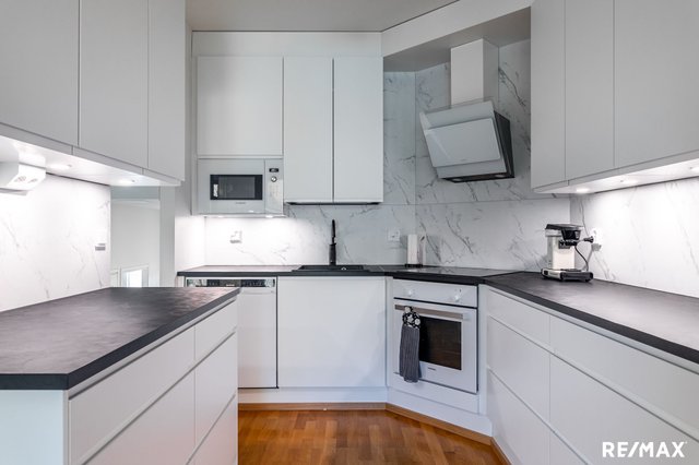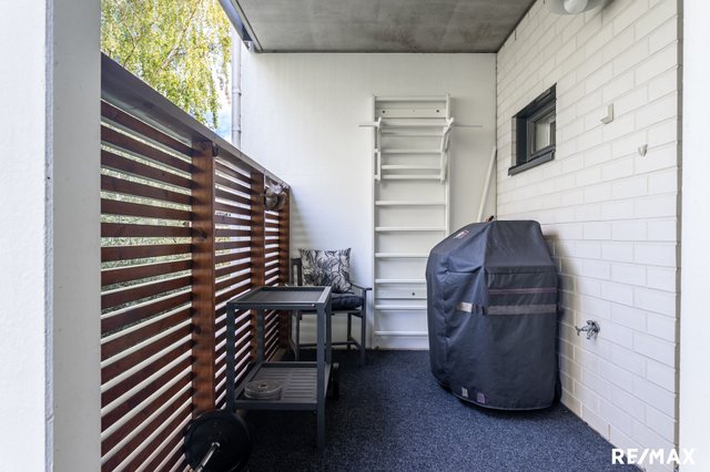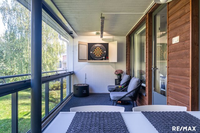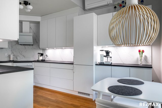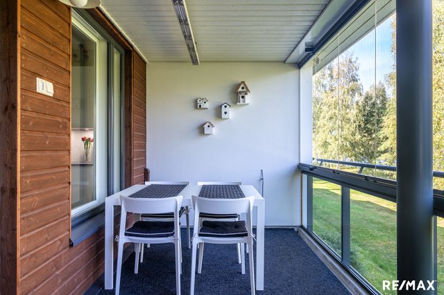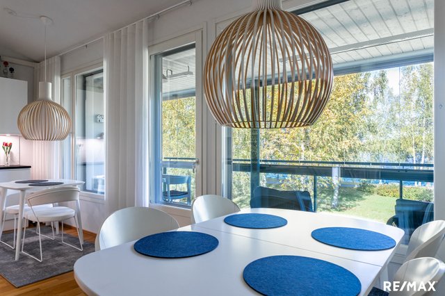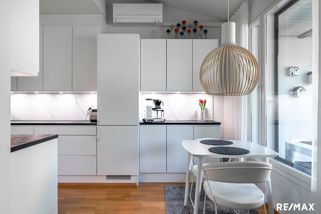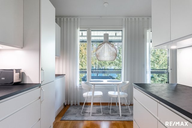 Olohuoneen ja keittiön suuret ikkunat tuovat runsaasti luonnonvaloa sisään ja luovat tilan tuntua. Parvekkeelta avautuu pohjoiseen suuntautuva näkymä, joka on täydellinen paikka nauttia aamukahvista tai ilta-auringosta. Keittiö on varusteltu laadukkaasti, ja sieltä löytyy kaikki tarvittava arjen sujuvuuteen.