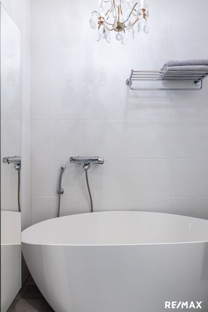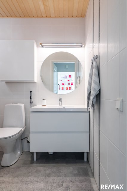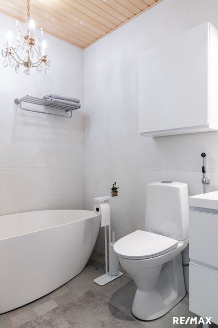 - Suihku, kylpyamme, lattialämmitys, wc-istuin, peili, allaskaappi, ja bidee-suihku