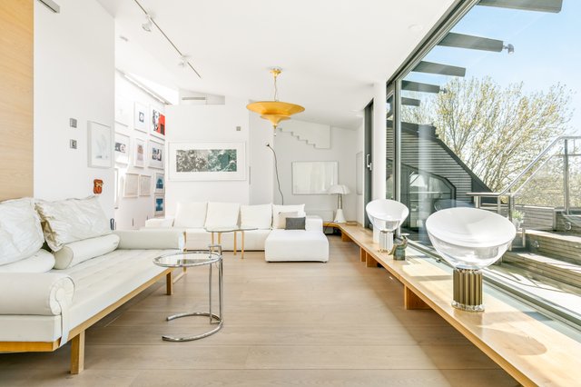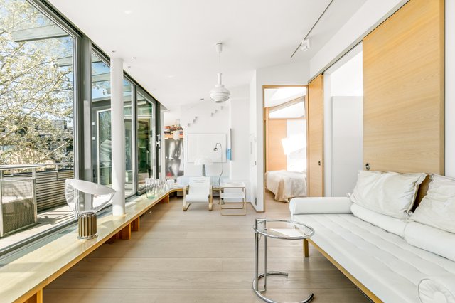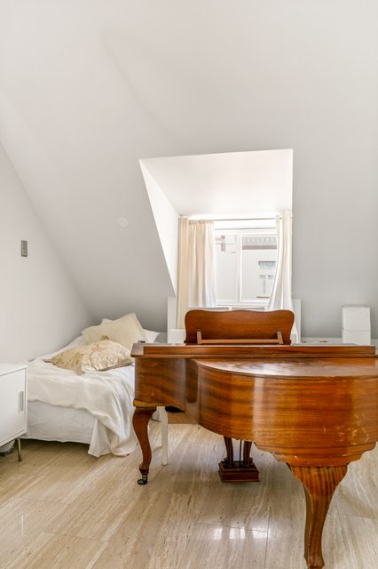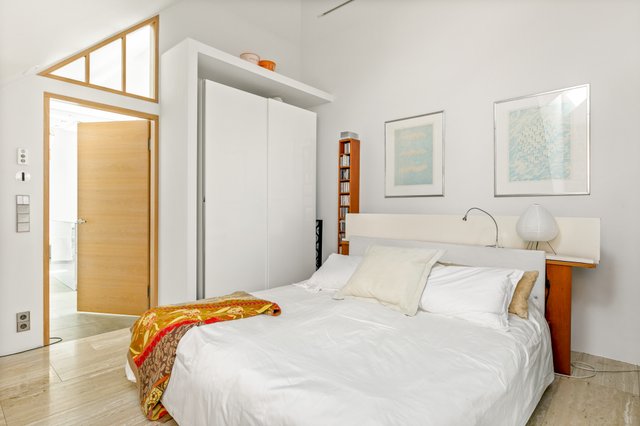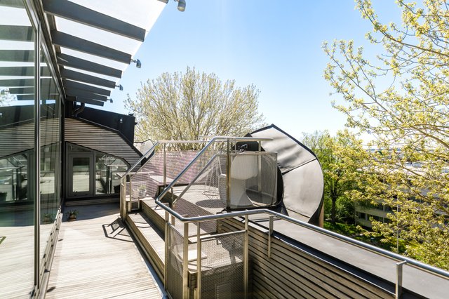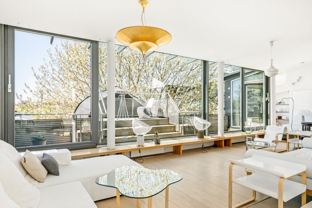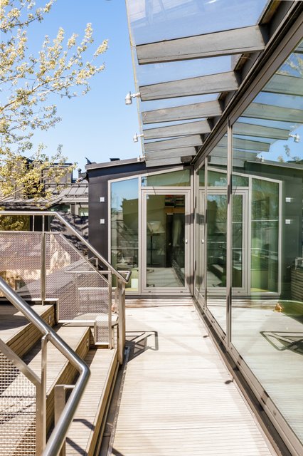 Asunnossa on avarat ja valoisat tilat. Poikkeuksellisen korkeat huoneet, paikoin jopa 4,5m korkeat. Suuret kattoikkunat luovat ilmavan tunnelman, jota korostaa olohuoneen lasiseinän kautta avautuva kattoterassi. Jalopuulla katetulta terassilta avautuvat upeat panoramanäkymät naapuritalojen kattojen yli merelle.