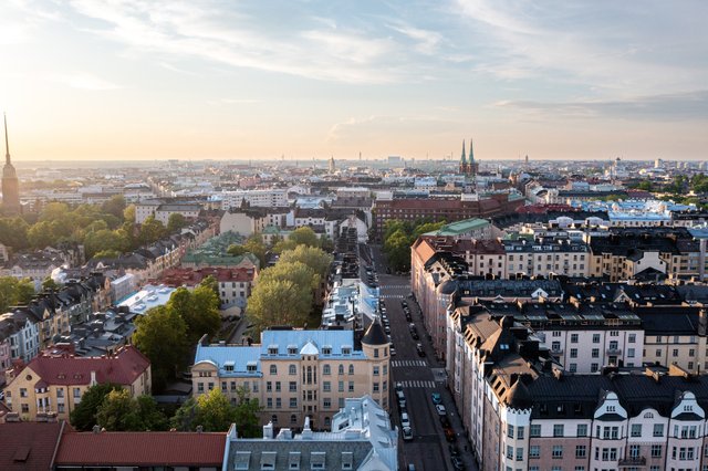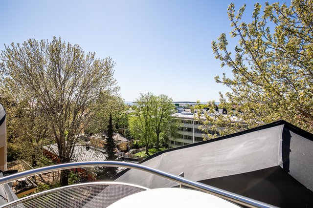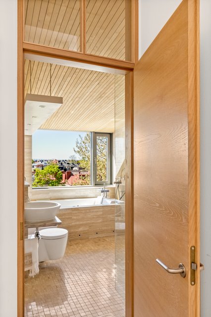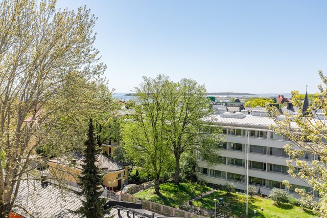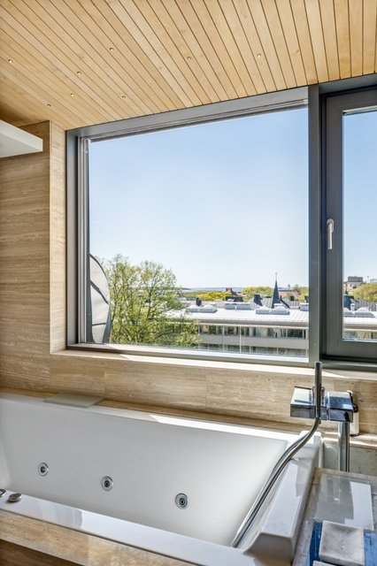 Lägenheten har ljusa och rymliga utrymmen och högt till tak – på vissa ställen över 4,5 meter. De stora takfönstren skapar en luftig atmosfär som fortsätter ut till takterrassen, som nås genom vardagsrummets glasvägg. Från den vackert trallbelagda terrassen öppnar sig en fantastisk panoramautsikt över hustaken mot havet, i riktning mot Ärtholmen och Löyly.