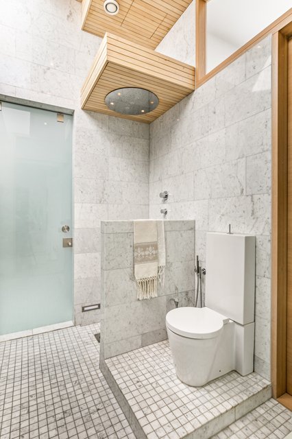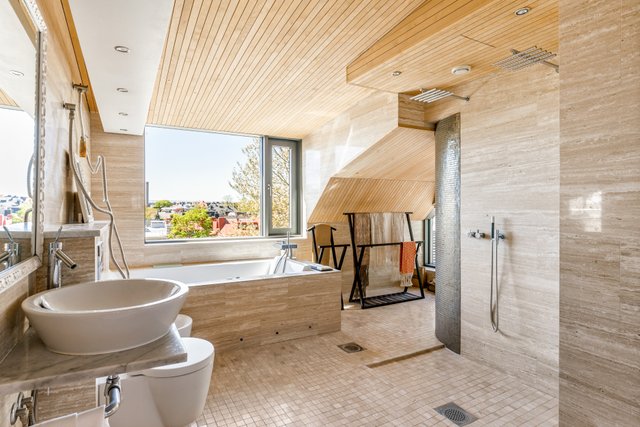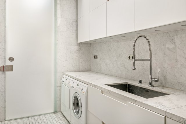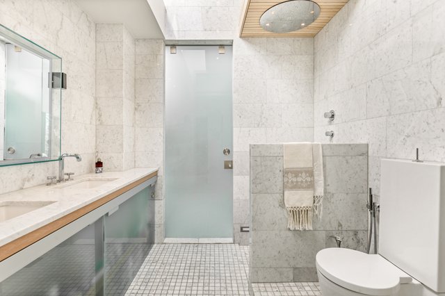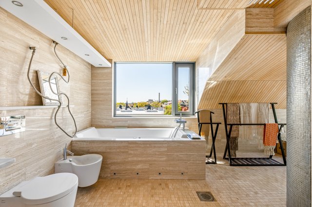 - Kylpyhuoneissa materiaaleina travertiini ja Carraran marmori (Bianco). Kaikki sekoittajat ja suihkut Vola ja Hans Grohe. Saniteettikalusteet Duravit ja Philippe Stark. Toisessa kylpyhuoneessa lisäksi poreamme, rättipatteri. Huoneistoon kuuluu myös erillinen WC.