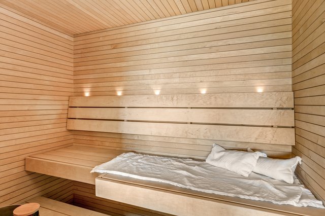 Bostaden består av tre sovrum, ett öppet kök, två badrum, en separat toalett och en bastu. Det tidlösa vita köket från Valcucine har eleganta arbetsytor i glas och högklassiga hushållsapparater från Gaggenau, vilket gör matlagningen till ett nöje. I anslutning till vardagsrummet finns en öppen spis, och i matsalen en gaseldstad. Det lyxiga spa-inspirerade badrummet erbjuder både bastu och bubbelbadkar. Badrummen och bastun är klädda i stilfulla stenmaterial.