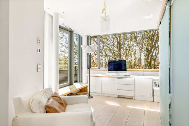 - Olohuoneessa liukuovin varustettu koko huoneen mittainen lasiseinä, joka avutuu terassille. Korkea huonekorkeus, kattoikkunat ja ilmavuus tekevät tästä kodista todella avaran ja valoisan.