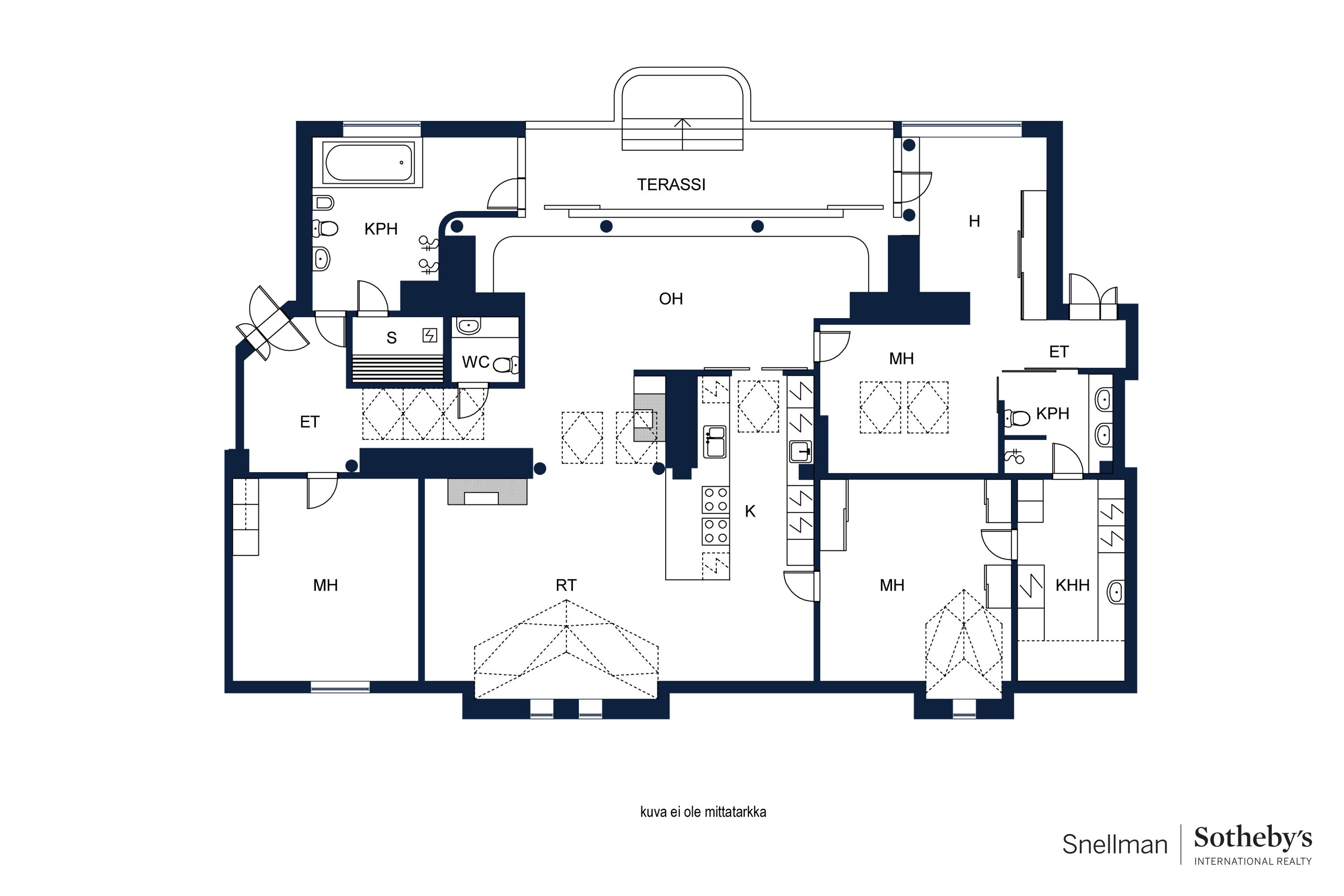 Asunnossa on kolme makuuhuonetta, olohuone, avokeittiö, kaksi kylpyhuonetta, erillinen wc ja sauna. Ajattomassa, valkoisessa Valcucine-keittiössä on laadukkaat lasitasot ja Gaggenaun kodinkoneet, jotka tekevät ruoanlaitosta nautinnon. Olohuoneen yhteydessä on takka ja ruokasalissa kaasutakka. Asunnosta löytyy ylellinen spa-kylpyhuone, jossa on sekä sauna että poreamme, ja sieltä on myös pääsy suoraan terassille. Kylpyhuoneet ja sauna on varustettu tyylikkäillä kivimateriaaleilla.