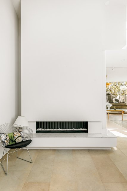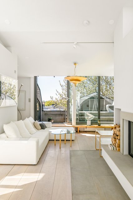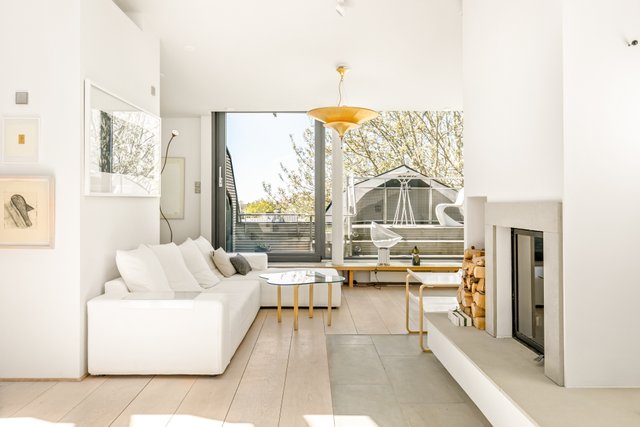 The home includes three bedrooms, an open-plan kitchen, two bathrooms, a separate toilet, and a sauna. The timeless white Valcucine kitchen features elegant glass countertops and high-quality Gaggenau appliances, making cooking a true pleasure. The living area includes a fireplace, while the dining room boasts a stylish gas fireplace. The luxurious spa-style bathroom offers both a sauna and a jacuzzi. The bathrooms and sauna are finished with elegant stone materials.