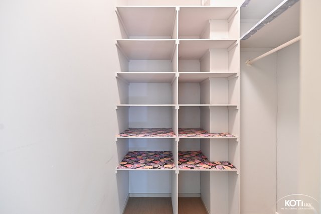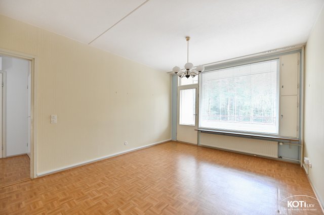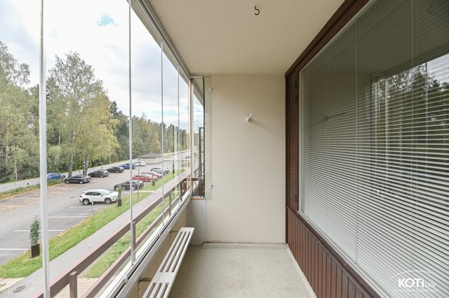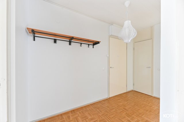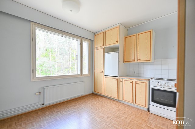 Asunnon keittiö sekä pinnat ovat siistissä ja asuttavassa kunnossa, mutta vaativampi ostaja suorittaa remontin ennen muuttoa. Kylpyhuone on kuitenkin uusittu putkiremontin yhteydessä 2018–2019. Keittiössä on tilaa ruokapöydälle ja näkymät keittiön ja makuuhuoneen ikkunasta ovat talon taakse, metsään päin. Makuuhuone on tilava ja siellä on vaatekaapit. Eteisen yhteydessä lisäksi vaatehuone.